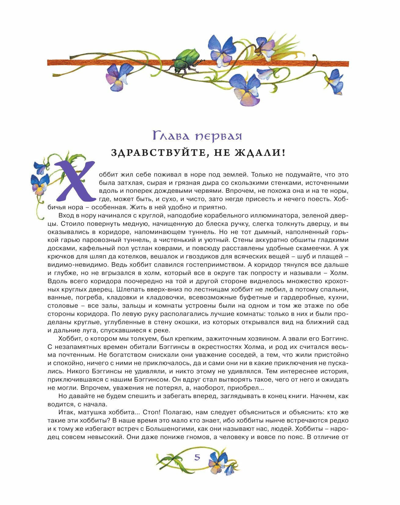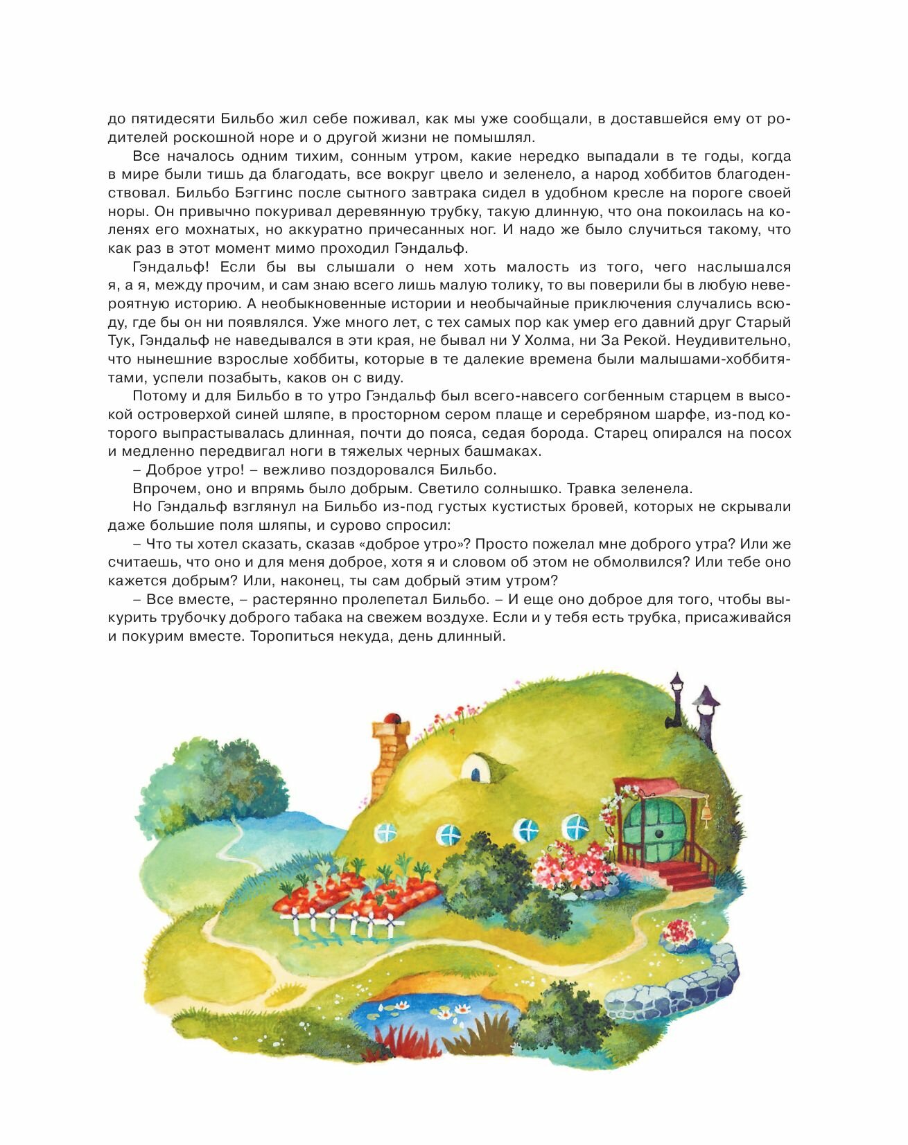 Жил-был на свете хоббит Бильбо. Если вы вдруг не знаете, то знайте: хоббиты - это такие маленькие существа, ростом с гномов, но не гномы. Бороды у них не растут, золото они не добывают и волшебством не занимаются. Зато умеют неслышно ходить и скрываться в мгновение ока, если нужно. А больше всего на свете любят обустраивать свои уютные норки, плотно обедать и вообще вести размеренную и спокойную жизнь.