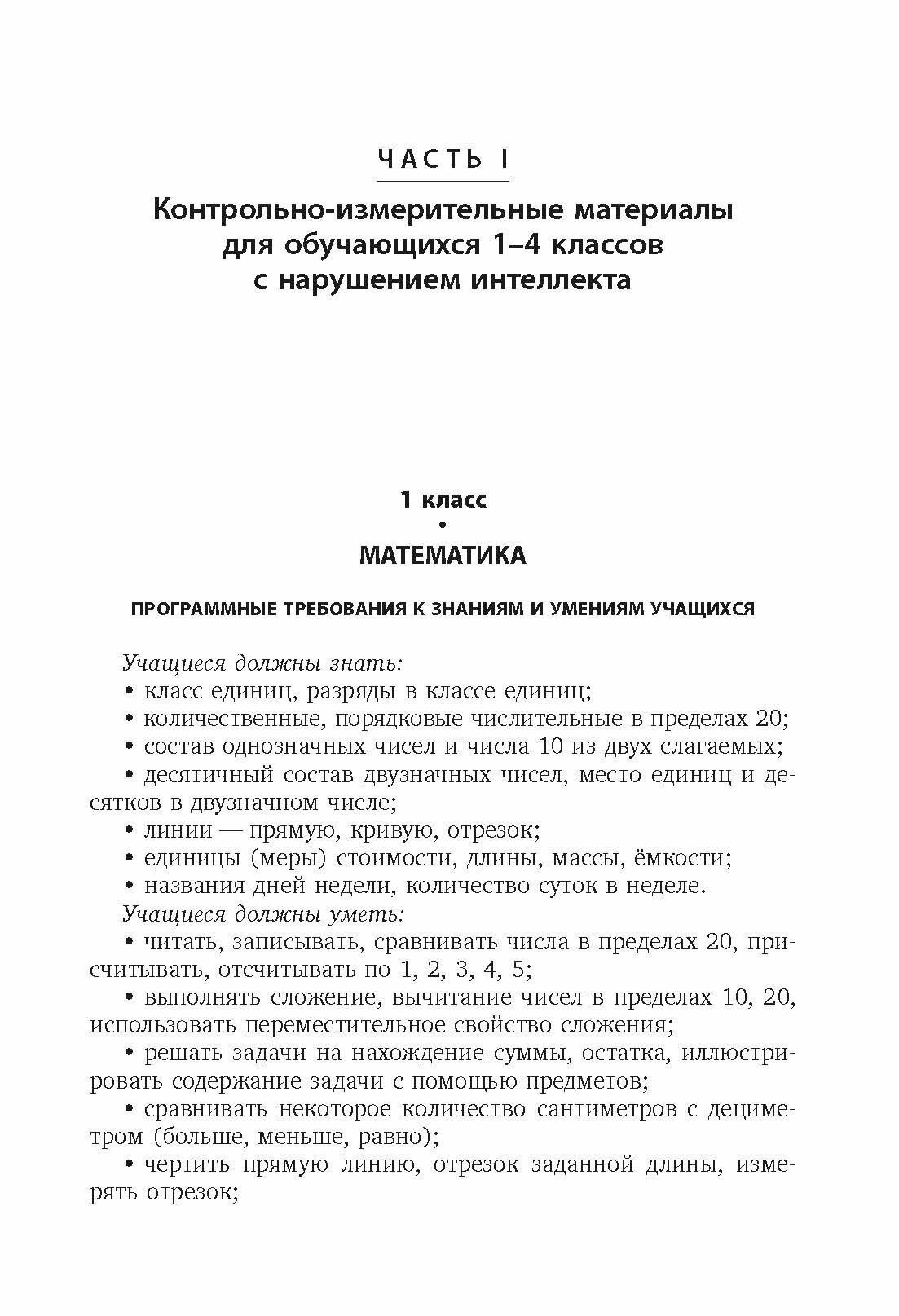 Пособие содержит контрольно-диагностические материалы для отслеживания результативности усвоения образовательной программы детьми с нарушением интеллекта, которые составлены с учётом требований Федерального государственного образовательного стандарта для обучающихся с ограниченными возможностями здоровья и обеспечивают государственные гарантии реализации заданных Стандартом дифференцированных уровней и вариантов начального школьного образования обучающихся с ограниченными возможностями здоровья. Задания учитывают программные требования по русскому языку, чтению и математике в 1 -9 классах специальных (коррекционных) образовательных учреждений VIII вида.