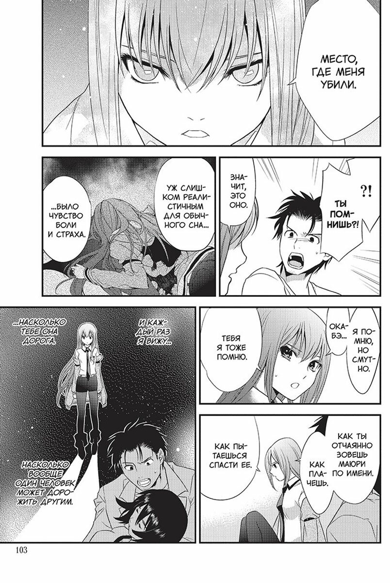 Окабэ продолжает раз за разом отправляться в прошлое, чтобы спасти жизнь Маюри. Но если ему удастся сделать это и вернуться в изначальную временную линию, то вместо Маюри погибнет Курису Макисэ. Окабэ приходится выбирать, кем пожертвовать...