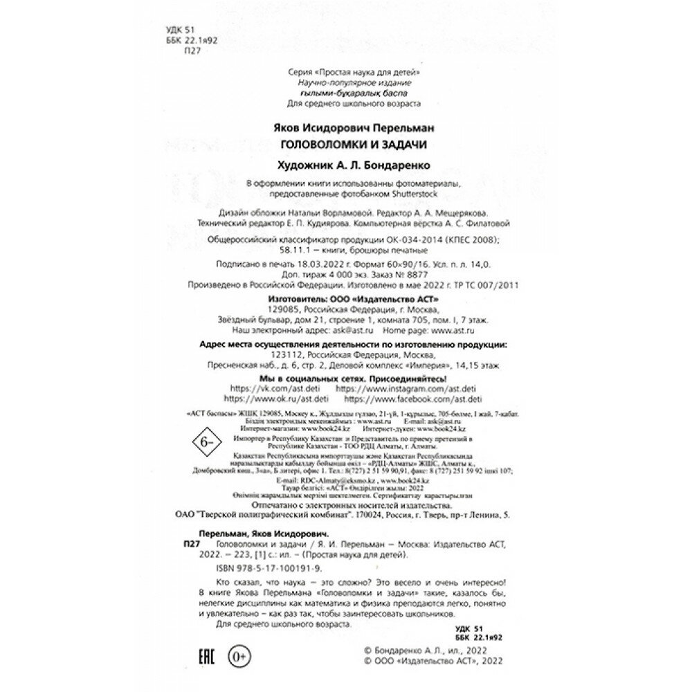 Головоломки и задачи (Перельман Яков Исидорович); ООО "Издательство Астрель", 2020