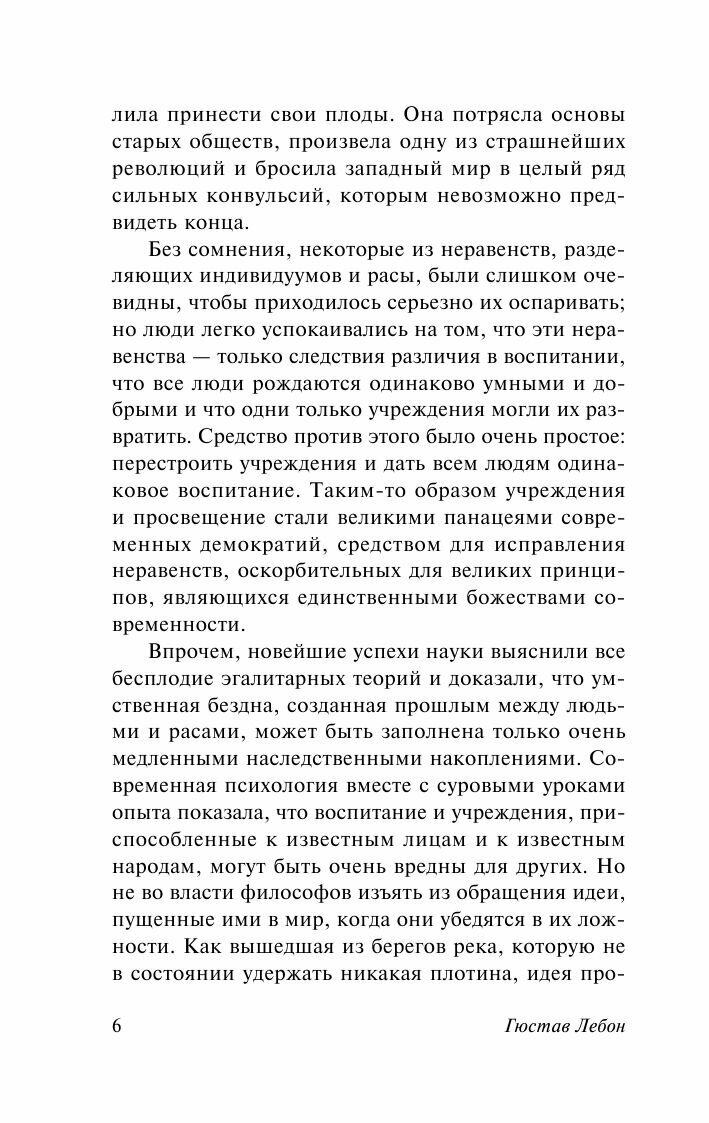 Удивительно актуальная, интересная книга. Язык, которым она написана, показался местами сложным, некоторые моменты приходилось перечитывать, чтобы понять смысл, но в общем, Лебон на страницах не только разбирает по полочкам и классифицирует толпу, но и высказывает большое количество мыслей, которые вроде бы лежат на поверхности, но о них не задумываешься до этого. Исследования автора кажутся фундаментальными, веришь данным. Лебон много места в книге уделяет религии и ее влиянию. Мысли и примеры, приведенные автором, очень актуальны. Для всех интересующихся психологией книгу рекомендую.