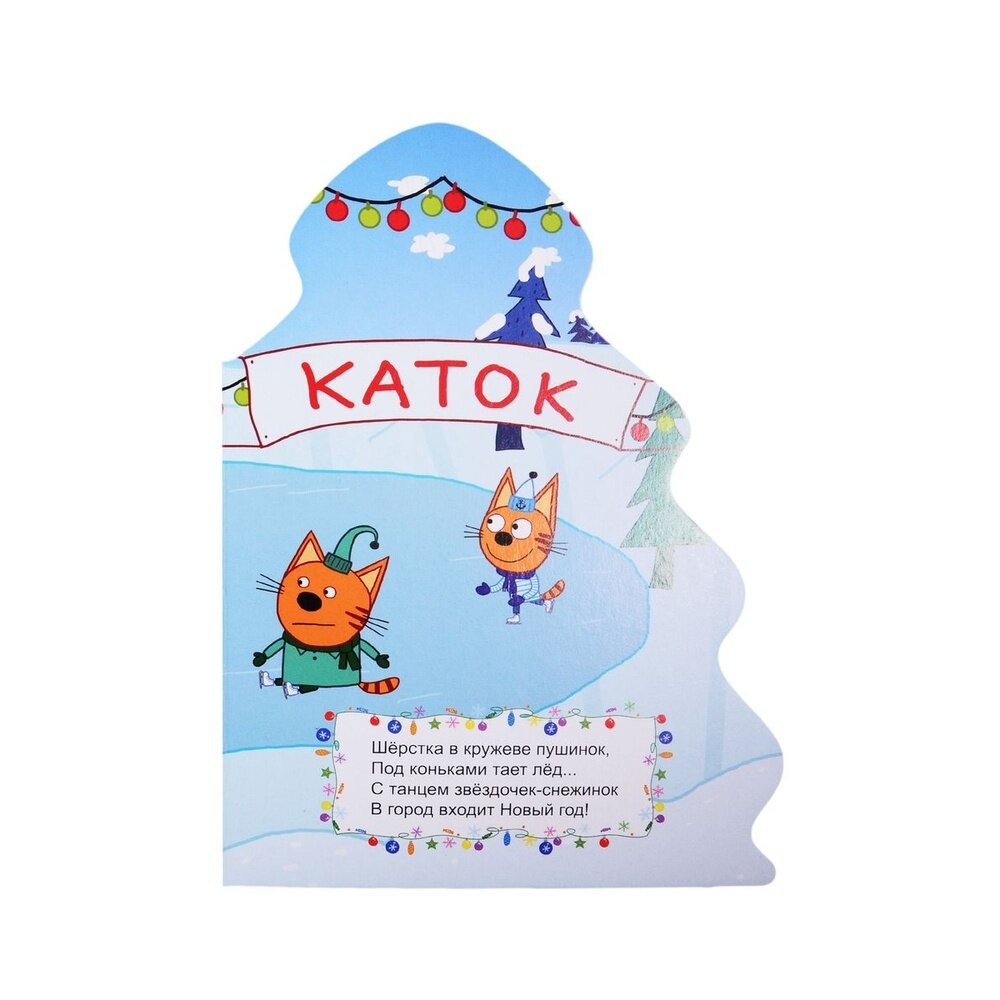 В данной книге герои знаменитого мультфильма "Три кота" готовятся отмечать Новый год,книжка содержит короткие четверостишья,посвященные теме праздника,зиме,катанию на коньках и другим зимним развлечениям.Иллюстрации красивые,яркие,герои легко узнаются,вот стишки только не очень понравились,какие-то они плохозапоминающиеся,с неровной рифмовкой.Страницы плотные,держатся в корешке хорошо.