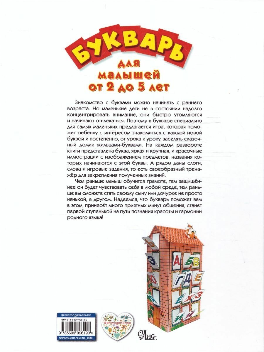 Знакомство с буквами можно начинать с раннего возраста. Но маленькие дети не в состоянии надолго концентрировать внимание, они быстро утомляются и начинают отвлекаться. Поэтому в букваре специально для самых маленьких предлагается игра, которая поможет ребёнку с интересом знакомиться с каждой новой буквой и постепенно, от урока к уроку, заселять сказочный домик жильцами-буквами. На каждом развороте книги представлена буква, яркая и крупная, и красочные иллюстрации с изображением предметов, названия которых начинаются с этой буквы. А рядом даны слоги, слова и игровые задания, то есть своеобразный тренажёр для закрепления полученных знаний.