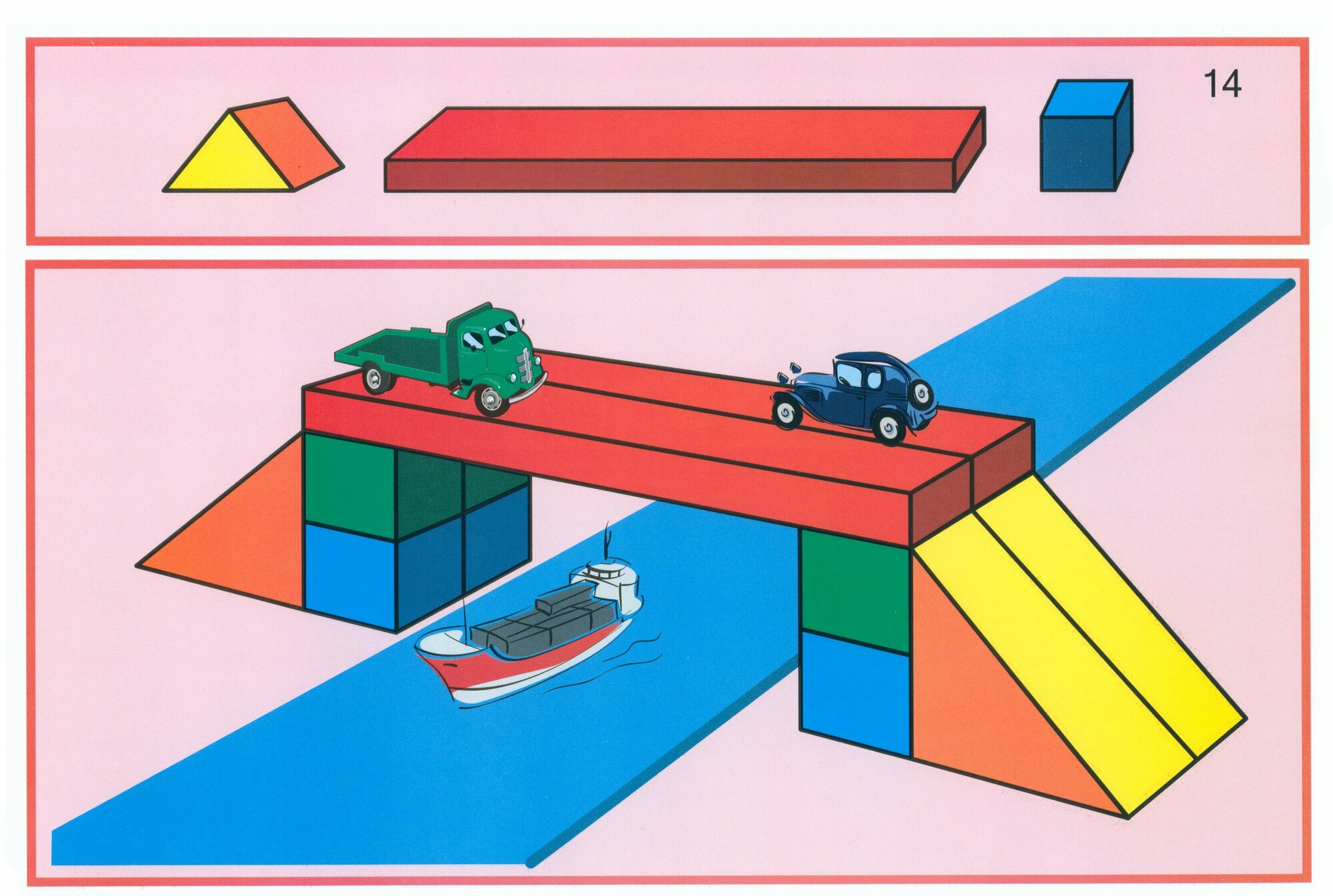 Предлагаемый наглядно-дидактический комплект "Конструирование из строительных материалов" включает в себя 14 красочно оформленных листов, позволяющих ребенку доступно и увлекательно в совместной деятельности со взрослым или самостоятельной игре осуществить в определенной технологической последовательности, действуя по алгоритму и применяя приемы конструирования со строительными деталями, построение восьми моделей (башня с флажками, мосты, гараж, двухэтажный дом, домик для мишки, ворота, кроватка для кукол, трамвай).