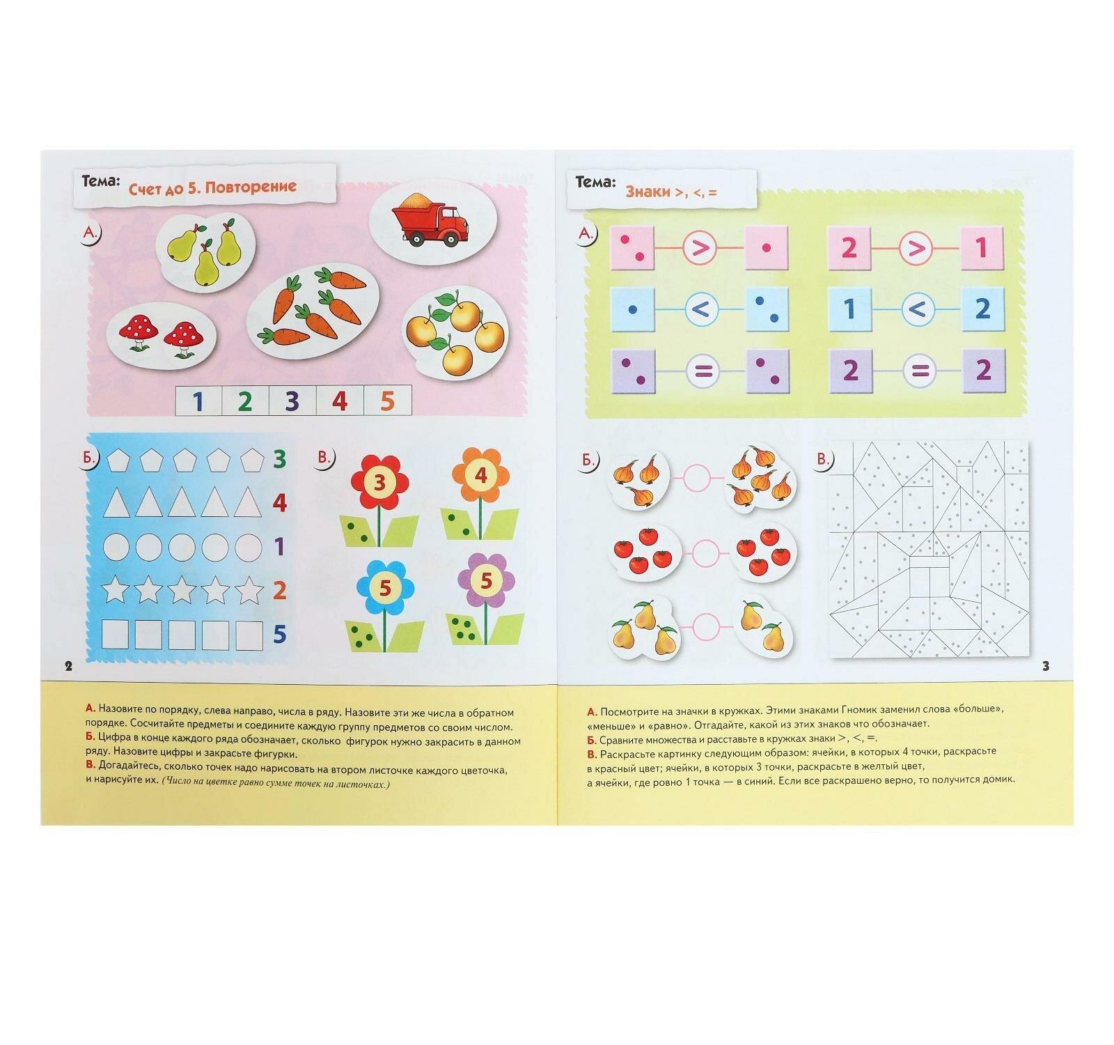 В пособии продолжается повторение материала по сравнению множеств и закрепляются знания счета до 5. Ребенок сможет освоить математические действия – сложение и вычитание. Даются понятия знаков «равенство», «больше» и «меньше». Пособие содержит простейшие логические задачи. Ребенок изучает числа от 6 до 10, осваивает состав чисел 3, 4, 5.