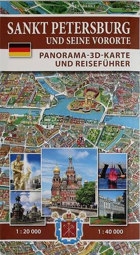 На уникальной панорамной карте Санкт-Петербурга (формат в развернутом виде 605 x 985 мм) в топографическом порядке воспроизведены все наиболее значимые памятники, комментарии к которым приводятся в тексте путеводителя. Цифра в кружке, сопровождающая изображение объекта, соответствует цифре около названия того же объекта в путеводителе.На лицевой стороне карты представлена территория исторического центра Санкт-Петербурга, данная в формате 3D, в масштабе ~1 : 20 000 На обороте карты представлена территория всего Санкт-Петербурга и его пригородов с дворцово-парковыми ансамблями, данная в формате 3D, в масштабе ~1 : 40 000.