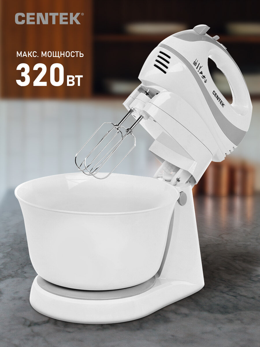 | Прочие особенности и свойства | Миксер Centek CT-1119, оборудованный 2.5-литровой пластиковой чашей, станет вашим надежным помощником на кухне. Получает питание от электрической сети. Подключение осуществляется с помощью кабеля, длина которого равна 1.15 м. ,,Цилиндрическое сечение венчиков,Переключатель скоростей |