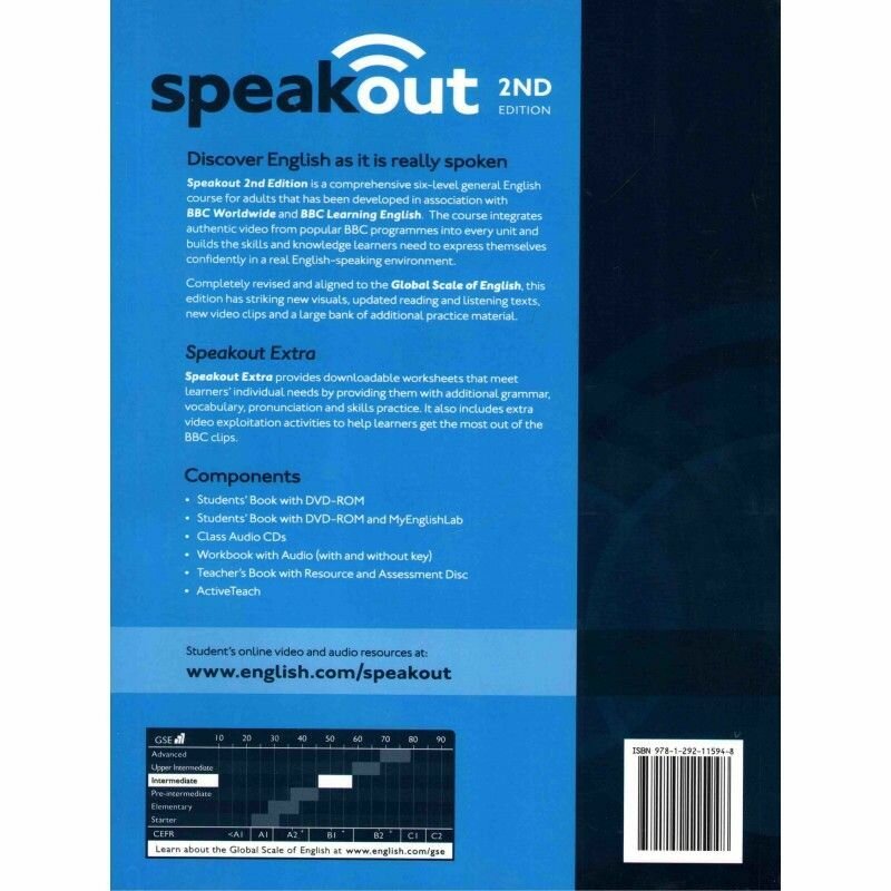 Speakout 2nd Edition is a comprehensive six-level general English course for adults that has been developed in association with BBC Worldwide and BBC Learning English. The course integrates authentic video from popular BBC programmes into every unit and builds the skills and knowledge Learners need to express themselves confidently in a real English-speaking environment. Completely revised and aligned to the Global Scale of English, this edition has striking new visuals, updated reading and listening texts, new video clips and a large bank of additional practice material. Speakout Extra provides downloadable worksheets that meet learners’ individual needs by providing them with additional grammar, vocabulary, pronunciation and skills practice. It also includes extra video exploitation activities to help learners get the most out of the BBC clips.