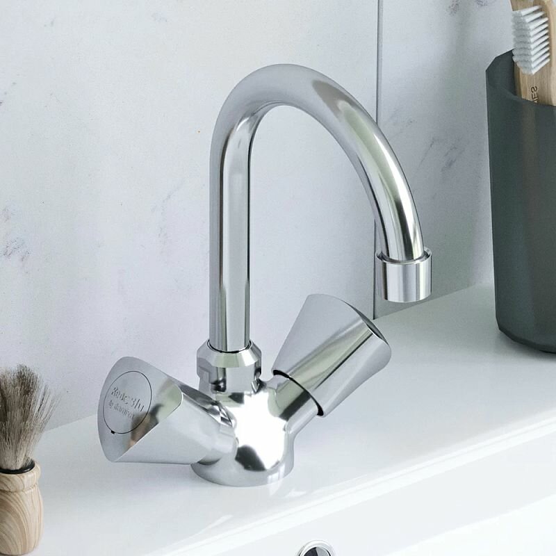 Смеситель RedBlu by damixa Object с изящным дугообразным изливом и аккуратными вентильными ручками треугольной формы элегантно смотрится на раковине в ванной.