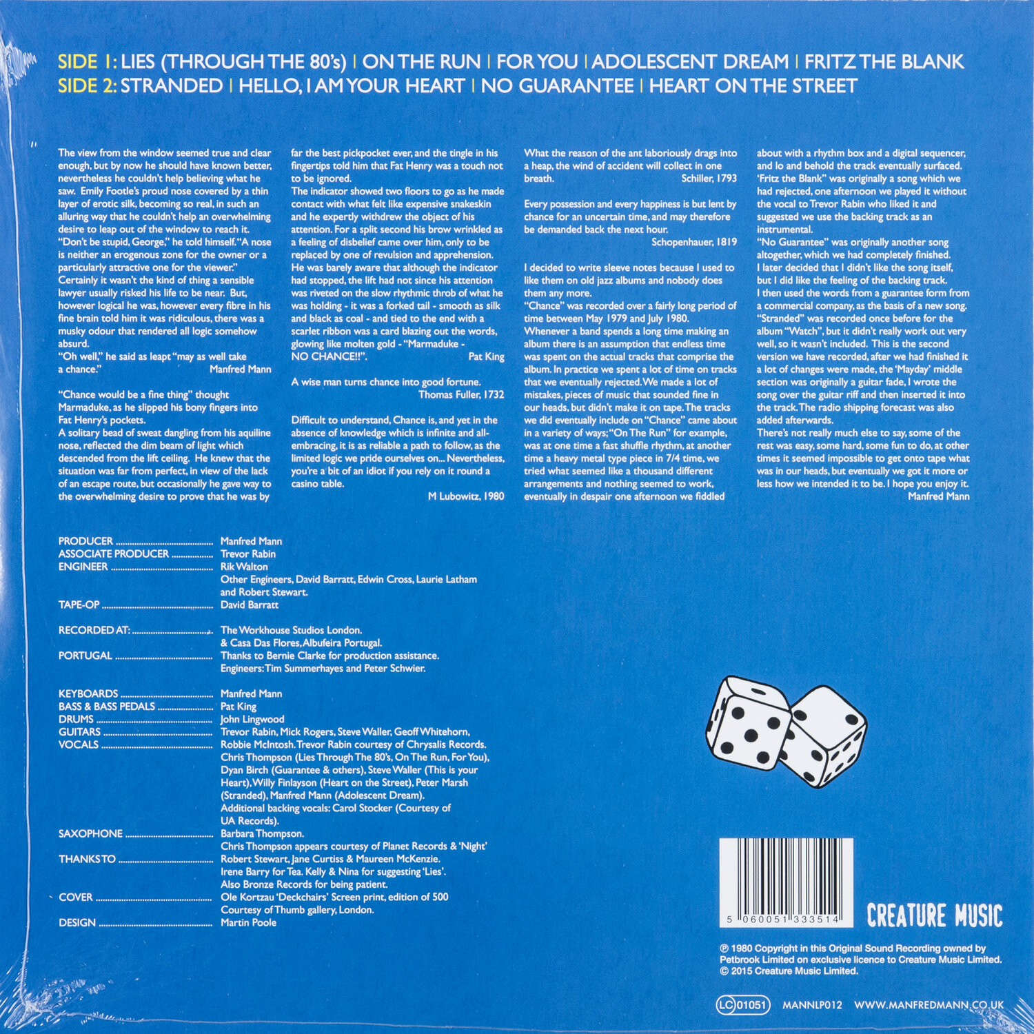 Manfred Mann's Earth Band – LP"" — десятый студийный альбом рок-группы Manfred Mann’s Earth Band, выпущенный 10 октября 1980 года лейблом «Bronze Records» в Великобритании и лейблом «Warner Bros. Records» в США. Записан на «The Workhouse Studios» (Лондон) и «Casa das Flores» (Албуфейра) в 1979 — 1980. Переиздан в 1999 году с добавлением четырёх бонус-треков. Manfred Mann’s Earth Band — английская рок-группа, созданная южноафриканским музыкантом Манфредом Манном. Их хиты включают каверы на песни Брюса Спрингстина «For You», «Blinded by the Light» и «Spirit in the Night». После образования в 1971 году и с коротким перерывом в конце 1980-х - начале 1990-х годов The Earth Band продолжает выступать и гастролировать. The Earth Band сочетает в себе стилистический подход прогрессивного рока с игрой Манна на синтезаторе Moog, элементы джаза и запоминающиеся мелодии. Помимо создания собственного материала, основным элементом музыки и живых выступлений группы с самого начала были также каверы на песни других современных поп / рок-исполнителей, особенно Боба Дилана и Брюса Спрингстина, в их стиле прогрессивного рока. TracklistA1 Lies (Through The 80’s) 4:33A2 On The Run 3:52A3 For You 5:42A4 Adolescent Dream 2:41A5 Fritz The Blank 2:51B1 Stranded 5:47B2 Hello, I Am Your Heart 5:16B3 No Guarantee 3:51B4 Heart On The Street 4:49Код производителя: 5060051333514