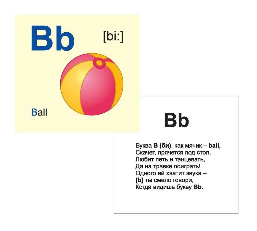 В комплект входит 32 карточки: из них, 26 карточек с буквами английского алфавита, где на лицевой стороне карточки красочное изображение буквы, её транскрипции и слово с картинкой, начинающееся на эту букву, на оборотной стороне - стихотворение, и 6 карточек с правилами чтения гласных букв.