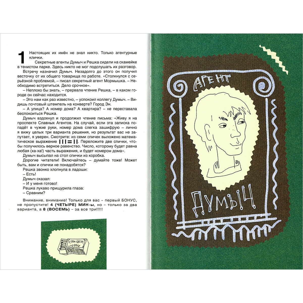 Содержание отличное - квест, который проходят агенты Думыч и Решка по пути к агенту Мормышке. Ну а мы присоединяемся к ним и решаем все встающие на пути задачки. Есть ответы, которые настоятельно рекомендуется не торопиться открывать. Всего заданий 23, некоторые из них простые, а над некоторыми придётся подумать. В зависимости от уровня сложности, ответы оцениваются в 3-10 бонусных минут, которые ребёнок может потом потратить на игру на любом гаджете по собственному усмотрению или с папой в приставку.