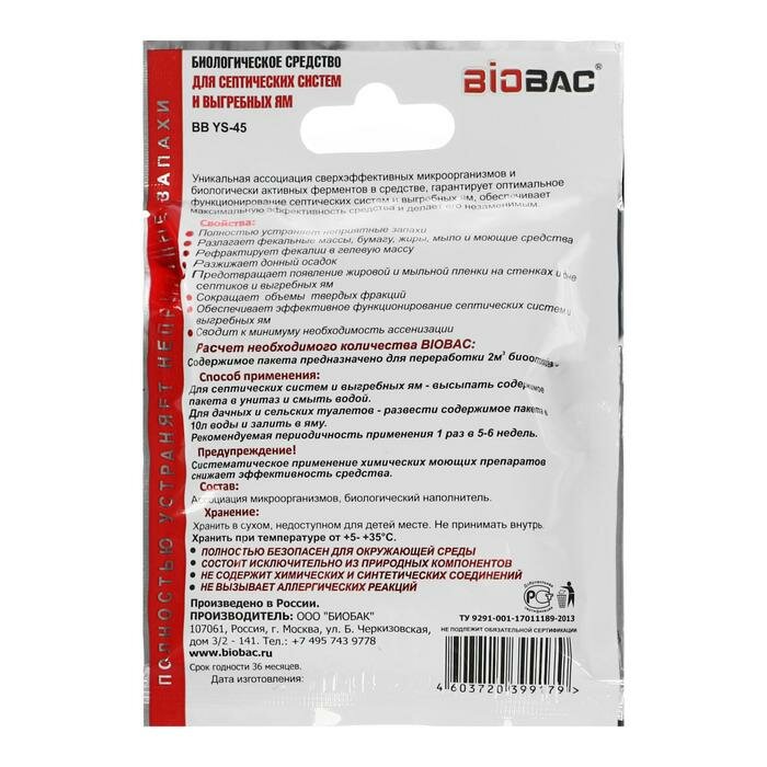 BioBac Биологическое средство для септических систем и выгребных ям BB-YS-45, 0.176 л/, 0.08 кг, 1 уп. БИОБАК