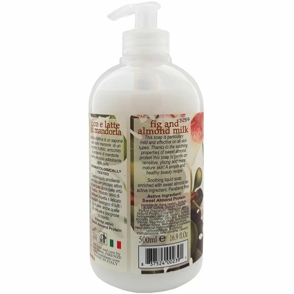 Удивительно нежное Жидкое мыло Il Frutteto Fig & Almond Milk (инжир и миндальное молоко) от итальянского бренда NESTI DANTE изготовлено по старинным рецептам и дорогостоящей уникальной котловой технологии исключительно из натуральных ингредиентов. Жидкое мыло произведено без применения синтетических ПАВ, имеет в своем составе натуральное оливковое и пальмовое масло, растительный экстракт миндального молочка, обогащено витамином Е. Имеет мощное противовоспалительное действие, глубоко увлажняет и питает кожу полезными микроэлементами. Не раздражает кожу лица и рук, особенно рекомендуется для сухой тусклой кожи. Эффективно очищает кожу, убирает омертвевшие частицы. Изумительно нежный сладковатый аромат инжира и миндального молочка окунет в атмосферу знойной Италии, дает ощущение наслаждения и чувственных фантазий.