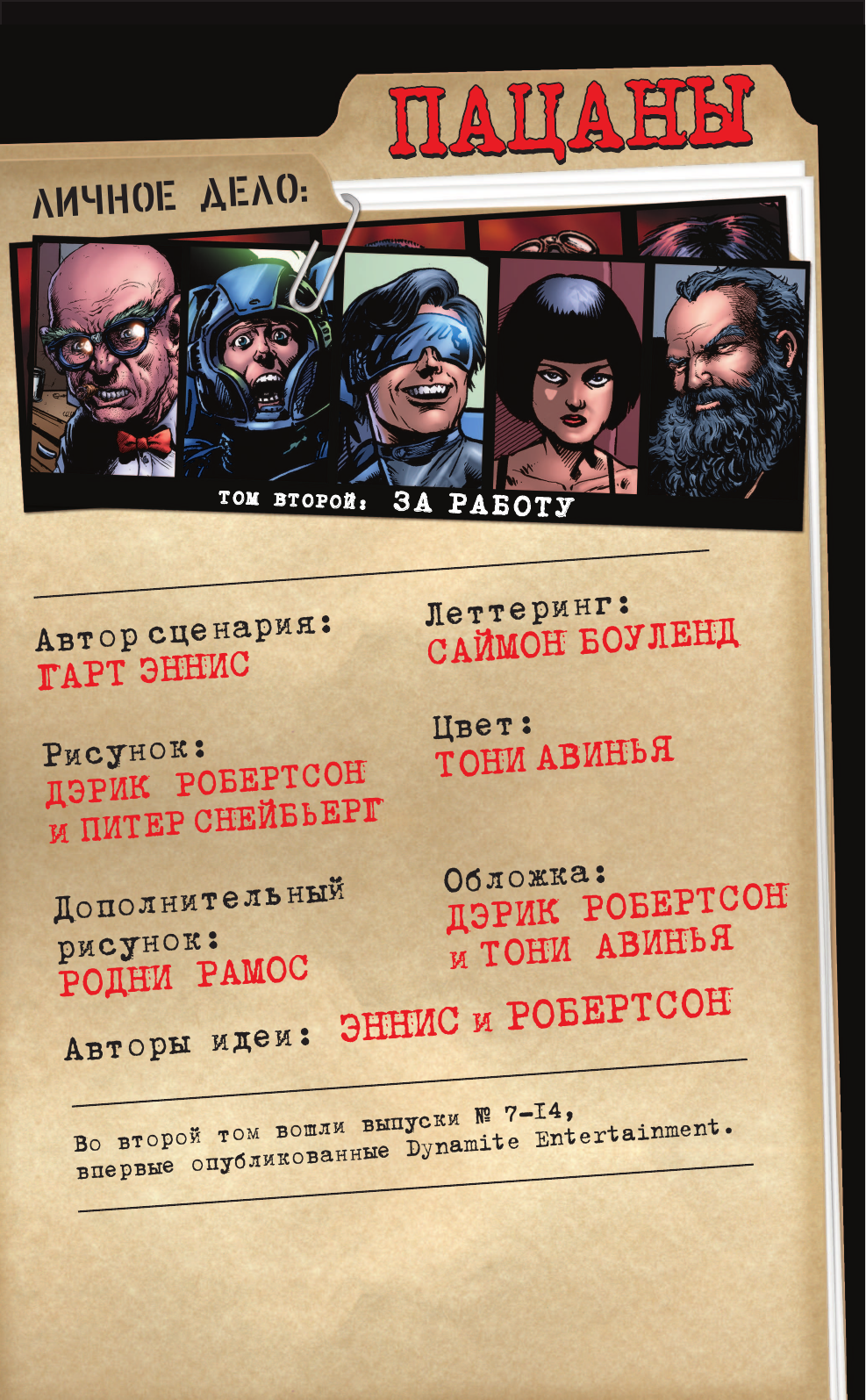 Второй том тех самых Пацанов! Здесь нам расскажут истории, которых не было в сериале. Например, в Россию наши герои поедут по совсем другим причинам и натолкнуться там на старого друга, который не оставит вас равнодушным! Градус безумия нарастает. Хьюи узнаёт больше секретов, а правительственный заговор начинает закручиваться. Оторваться невозможно пока не закончатся все страницы.
