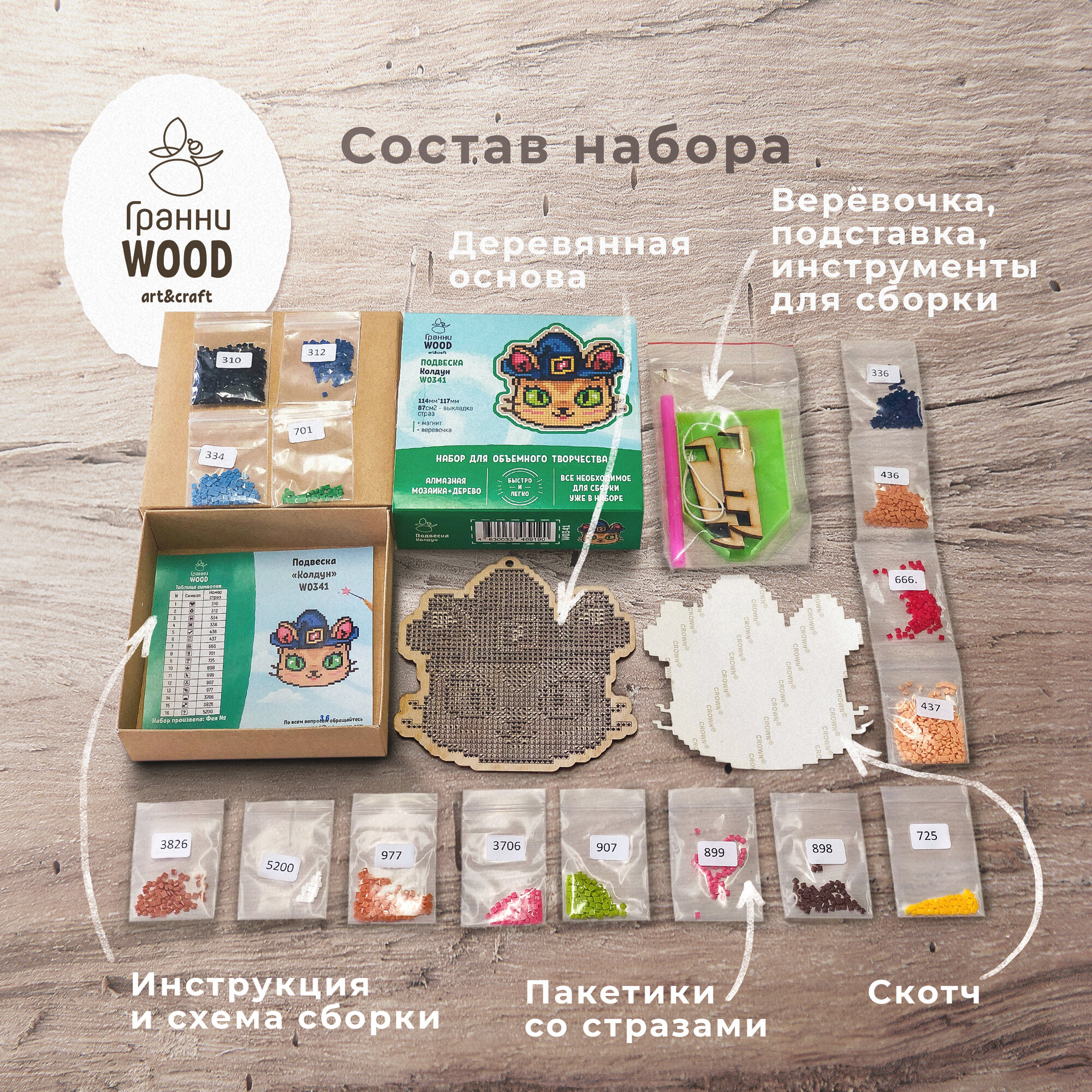 | В набор входит | деревянная основа, клеевая основа с защитным слоем, инструкция, акриловые камни-стразы, стилус/пинцет, треугольное блюдце, магнит, веревочка. |