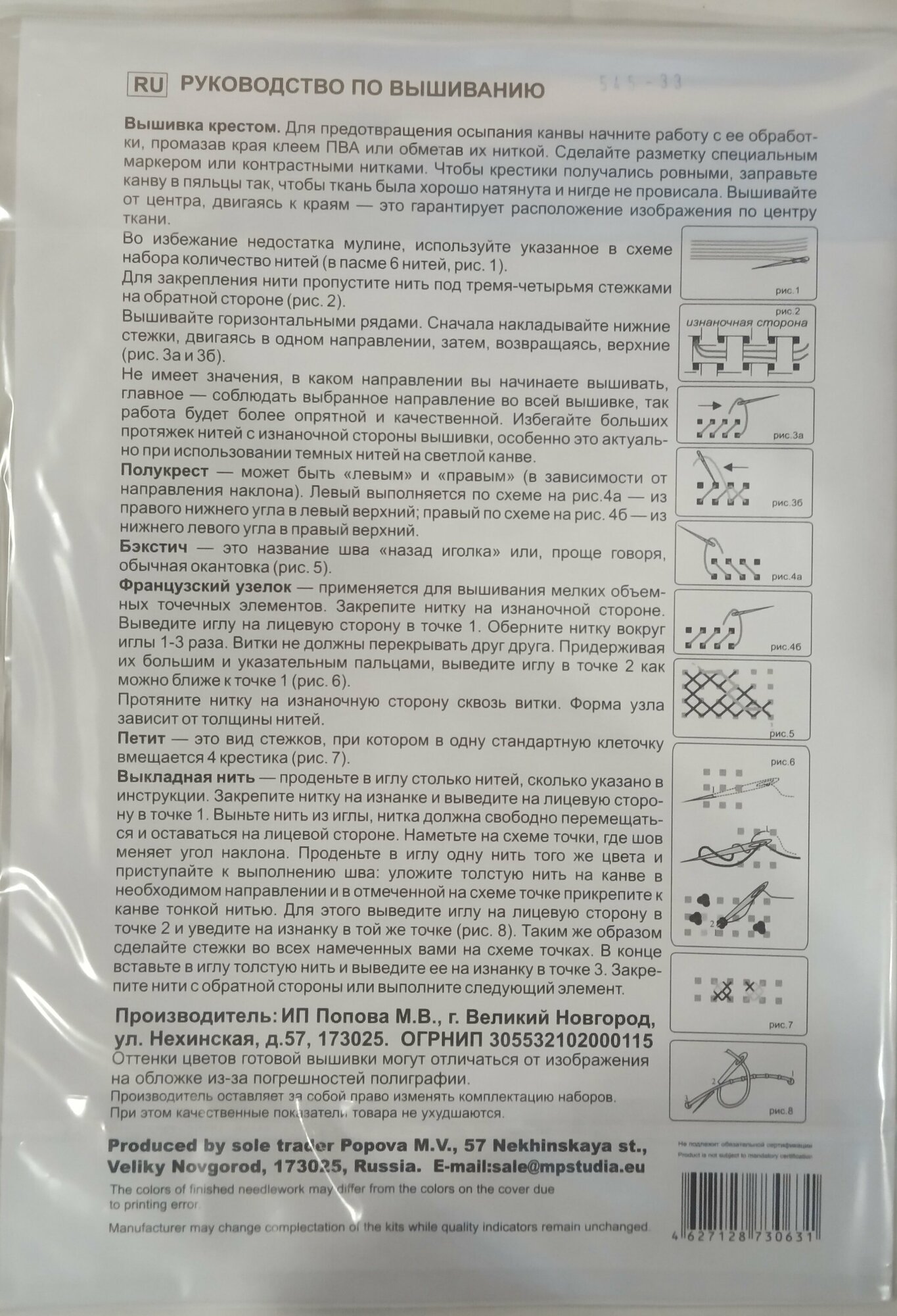 | В набор входит | хлопковая канва Aida 14 ct белого цвета, хлопковое мулине (21 цвет), цветная символьная схема, игла, инструкция. |