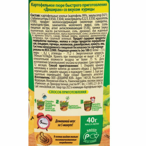 | Состав | картофельные хлопья, продукт комплексный жировой (жир растительный, лактоза, молочный белок), соль йодированная, гренки (мука пшеничная, масло растительное, соль, дрожжи), лук жареный (лук, масло растительное, мука пшеничная, соль), усилитель вкуса (е621), сахар, белый перец, куркума, ароматизатор "вареная курица", петрушка, лук сушеный зеленый. продукт содержит пшеничную муку, продукты переработки молока. продукт может содержать следовые количества сои и продукты ее переработки. |