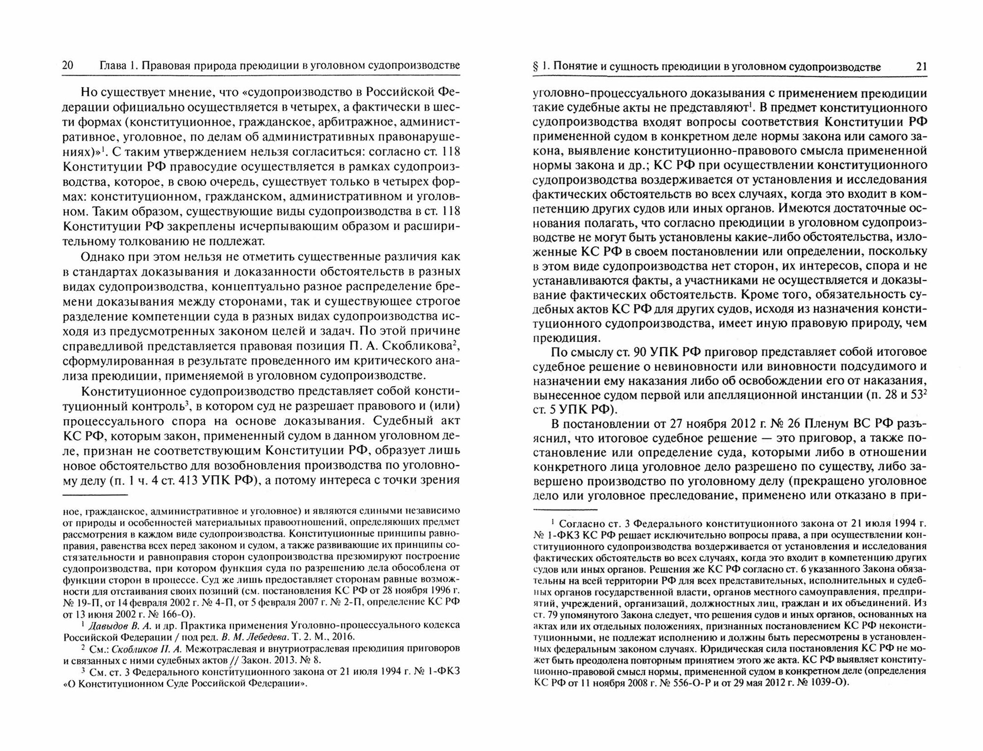В работе освещаются актуальные вопросы, связанные с правовой природой преюдиции как правила доказывания в уголовном судопроизводстве и в иных видах судопроизводства, предусматривающих доказывание, а также теоретические и практические аспекты реализации (применения) или преодоления (неприменения) преюдиции.