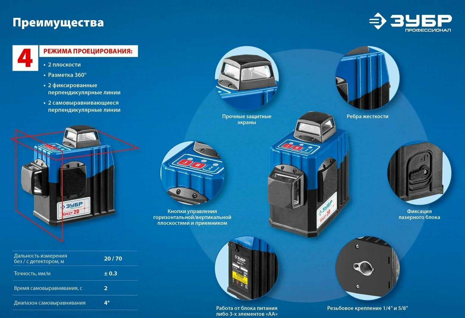 Прибор позволяет выполнить разметку одному человеку, что значительно повышает производительность труда. 4 режима проецирования линий. Функция автовыравнивания не требует настройки, обеспечивая повышенную точность при разметке. Диапазон компенсирования ± 4° для установки на неровную поверхность.