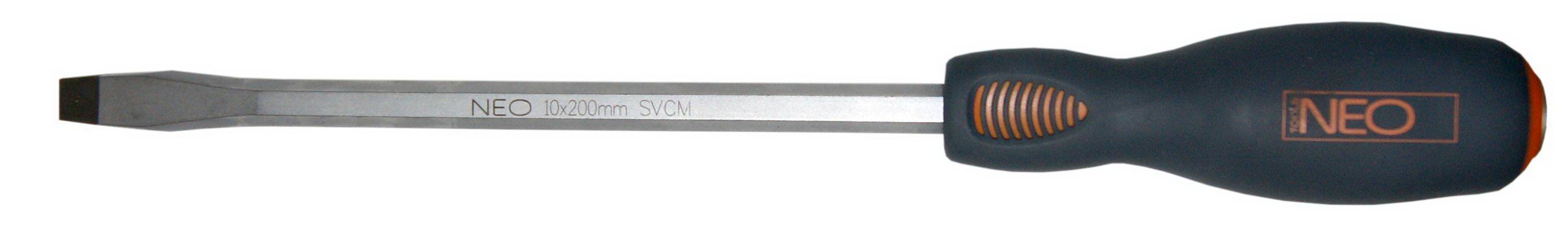 Отвертка шлицевая для подбивания NEO. Специально усиленный стержень отвертки изготовлен из чрезвычайно прочной S2 стали. Рабочая часть подвергнута термообработке, благодаря чему получена требуемая твердость и стойкость к изгибу 56 HRC. Отвертка с намагниченным жалом и рукояткой для подбивания. Трехгранная форма рукоятки с профилированной опорой для большого пальца уменьшает нагрузку на ладонь во время работы и облегчает быстрое вращение отвертки. Двухкомпонентная рукоятка предотвращает скольжение в ладони, стойкая к воздействию химических веществ, масел и смазок. Качество инструмента подтверждено сертификатом TÜV. Бренд NEO оправдывает ожидания профессионалов.