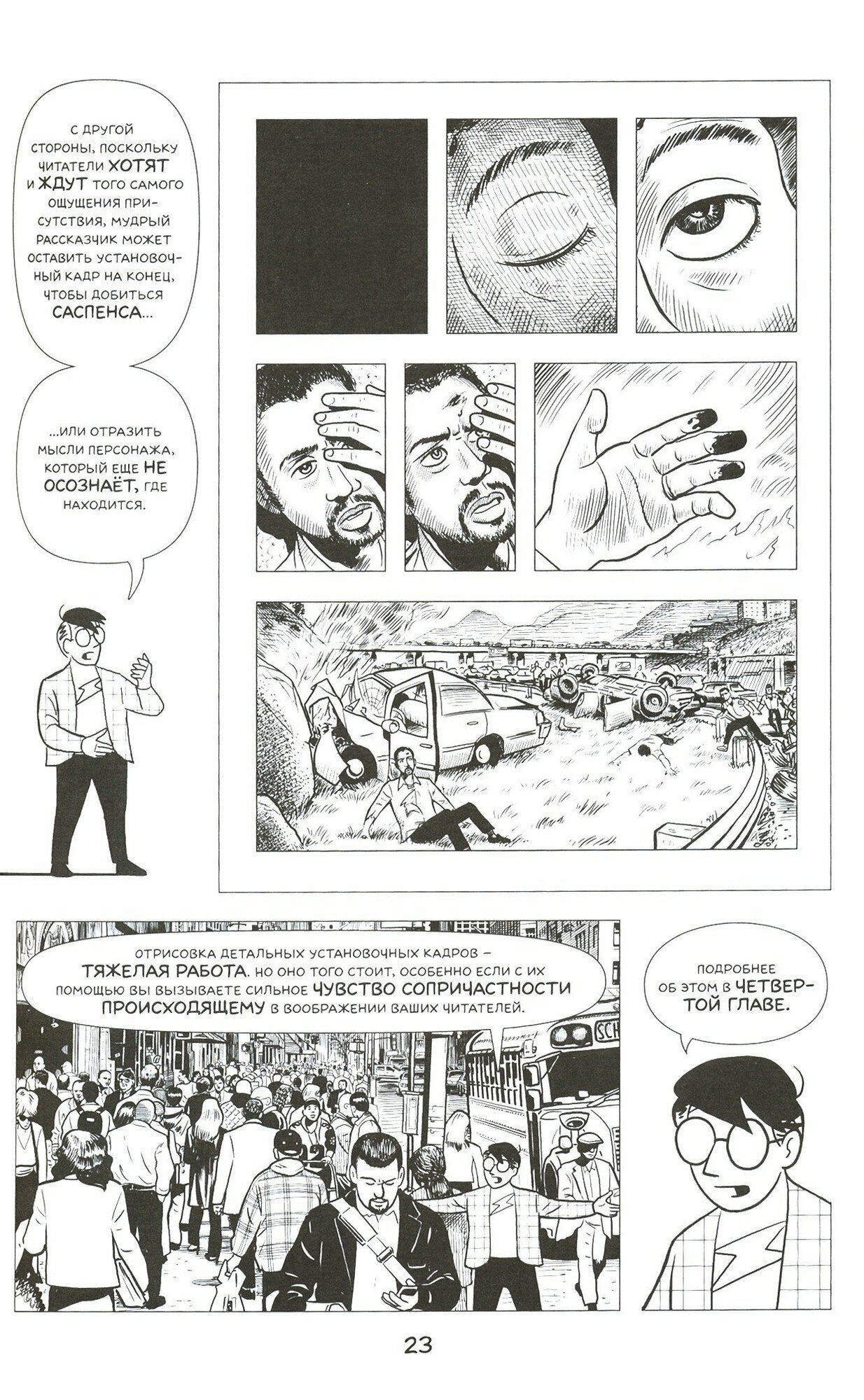 Покупал эту книгу, чтобы лучше понимать и разбтиаться в комиксе, так как хоть я и не художник, но издание очень дельное, интересное. Его приятно читать, даже если вы не целевая аудитория, потому что в фирменном стиле автора советы воспринимаются без проблем, и просто приятно наблюдать волшебство превращения чистого листа в наполненный историей и смыслом отрывок.