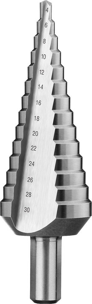 Сверло ЗУБР ступенчатое по сталям и цвет. мет. ст. Р6М5, d=4-30мм, 14ступ. d=4-30, L-100мм, трехгран. хв.10мм