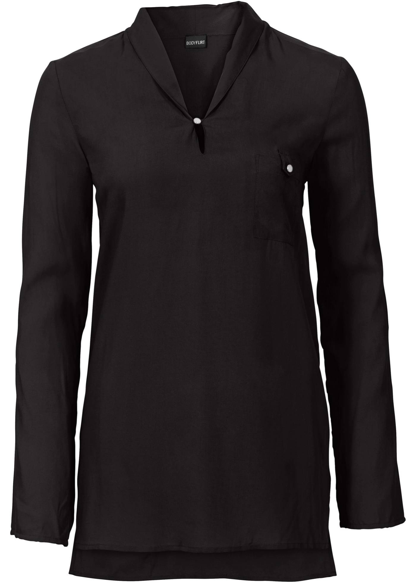 Модная удлиненная блузка марки BODYFLIRT с красивым шалевым воротником. Закатывающиеся рукава с возможностью фиксации на хлястики. Непринужденный покрой. Длина ок. 80 см (разм. 38) и ок. 80 см (разм. 46).