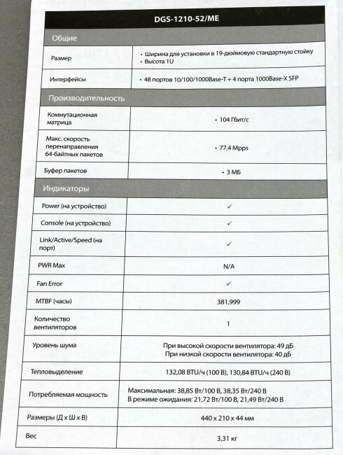 | Комплектация | Коммутатор DGS-1210-52/ME, кабель питания, фиксатор для кабеля питания, консольный кабель с разъемом RJ-45, 2 крепежных кронштейна для установки в 19-дюймовую стойку, 4 резиновые ножки, комплект для монтажа, краткое руководство по установке, компакт-диск |