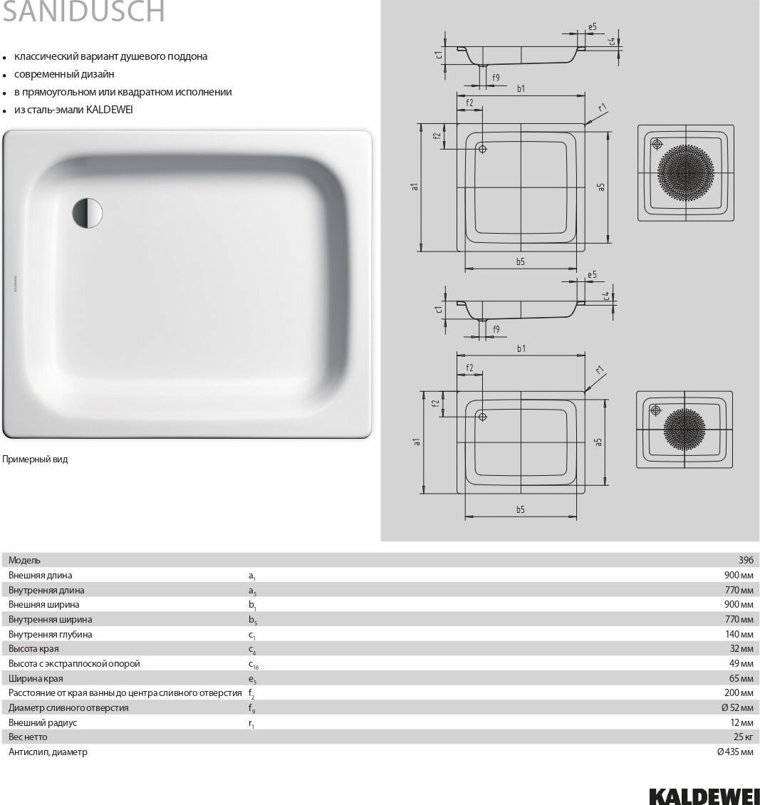 Sanidusch 331100010001 Поддон душевой (90х90 см) Kaldewei (размер: 90 x 90)