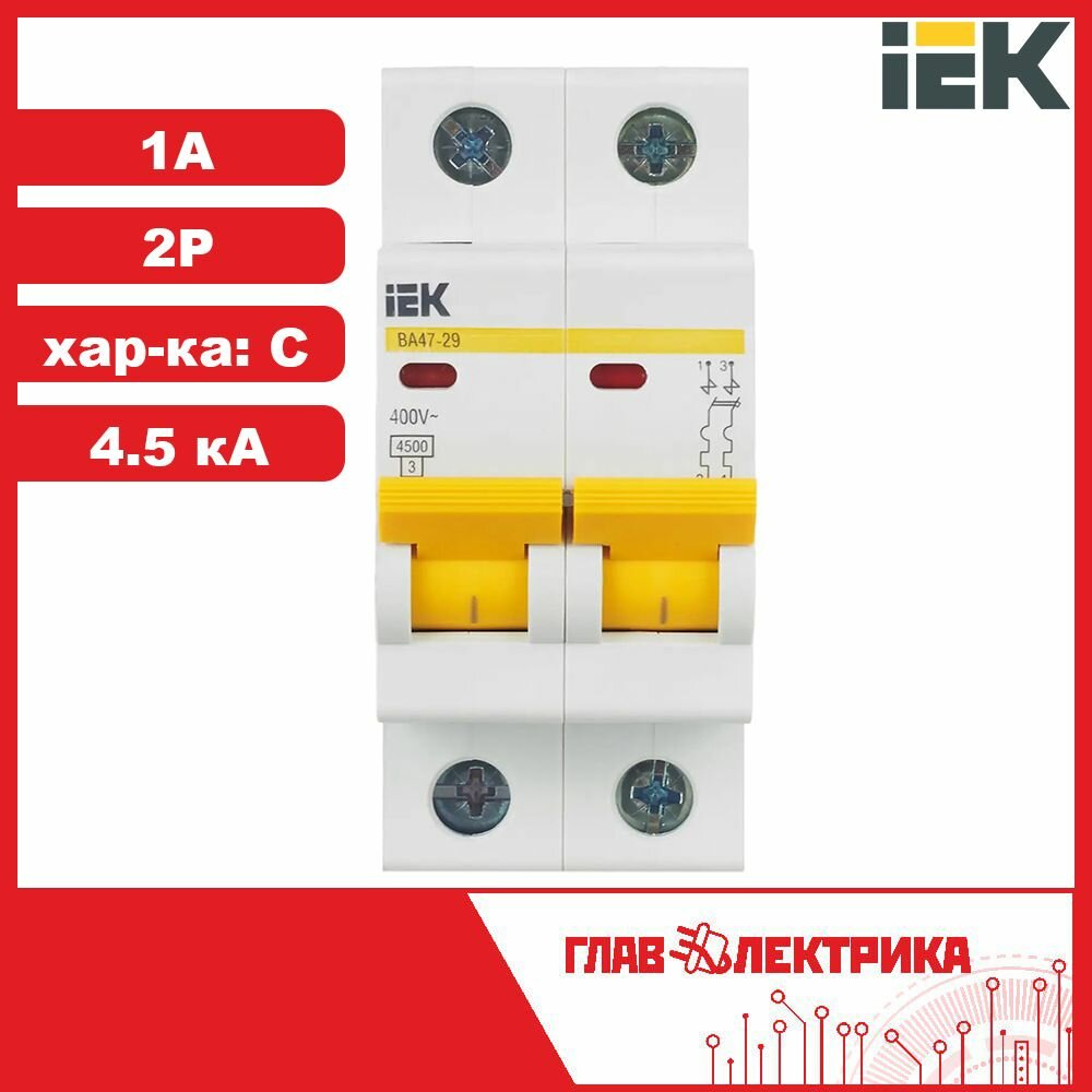 ВА47-29 MVA20-2-001-C Автоматический выключатель двухполюсный 1А (4.5 кА, C) IEK ВА47-29 2п, B, 1А, 4.5кА