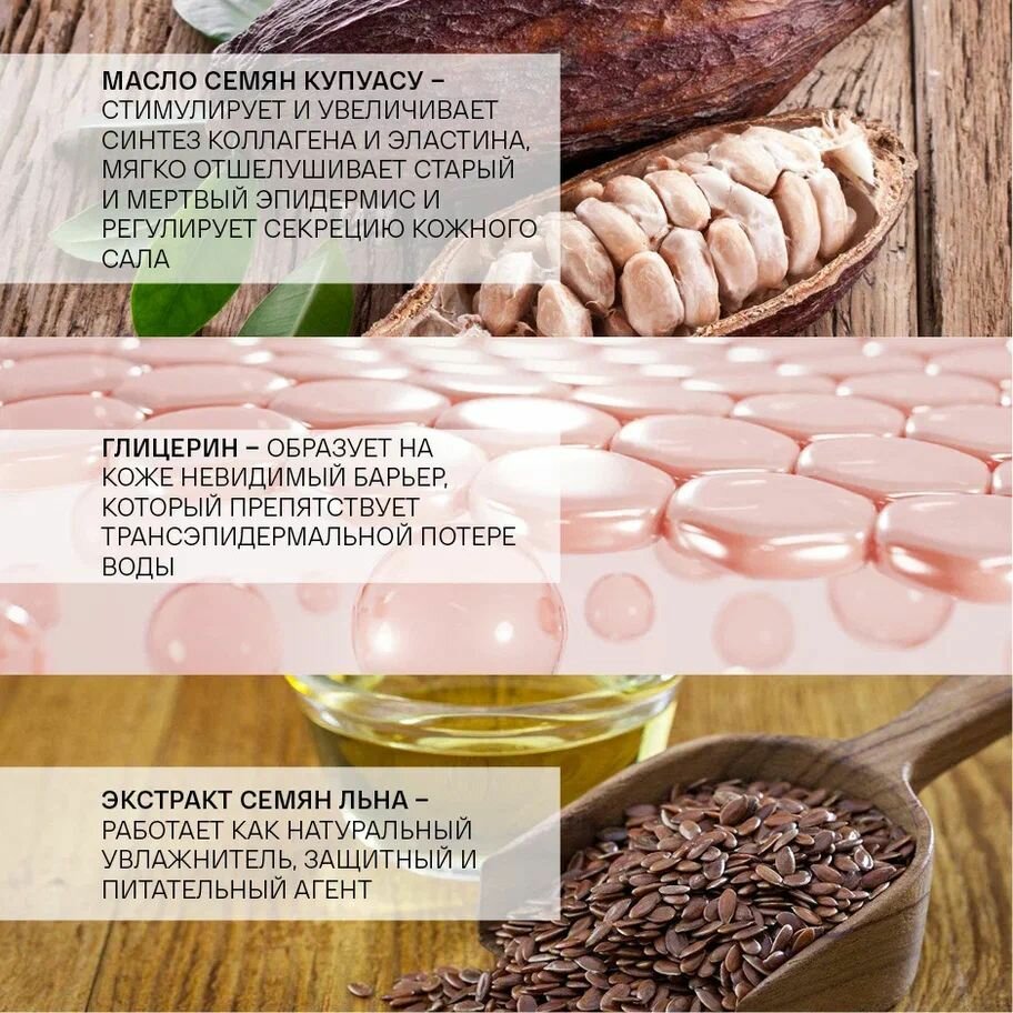 | Активные компоненты | Комплекс Telosense Active, Сквалан, Пропиленгликоль, Масло Семян Купуасу, Гидролизат Соевых Белков, Гидролизат Дрожжевых Белков, Глицерин, Экстракт Семян Льна, Каприловый Триглицерид, Комплекс Actirose, Экстракт Цветков Василька, Витамин Е, Аллантоин |