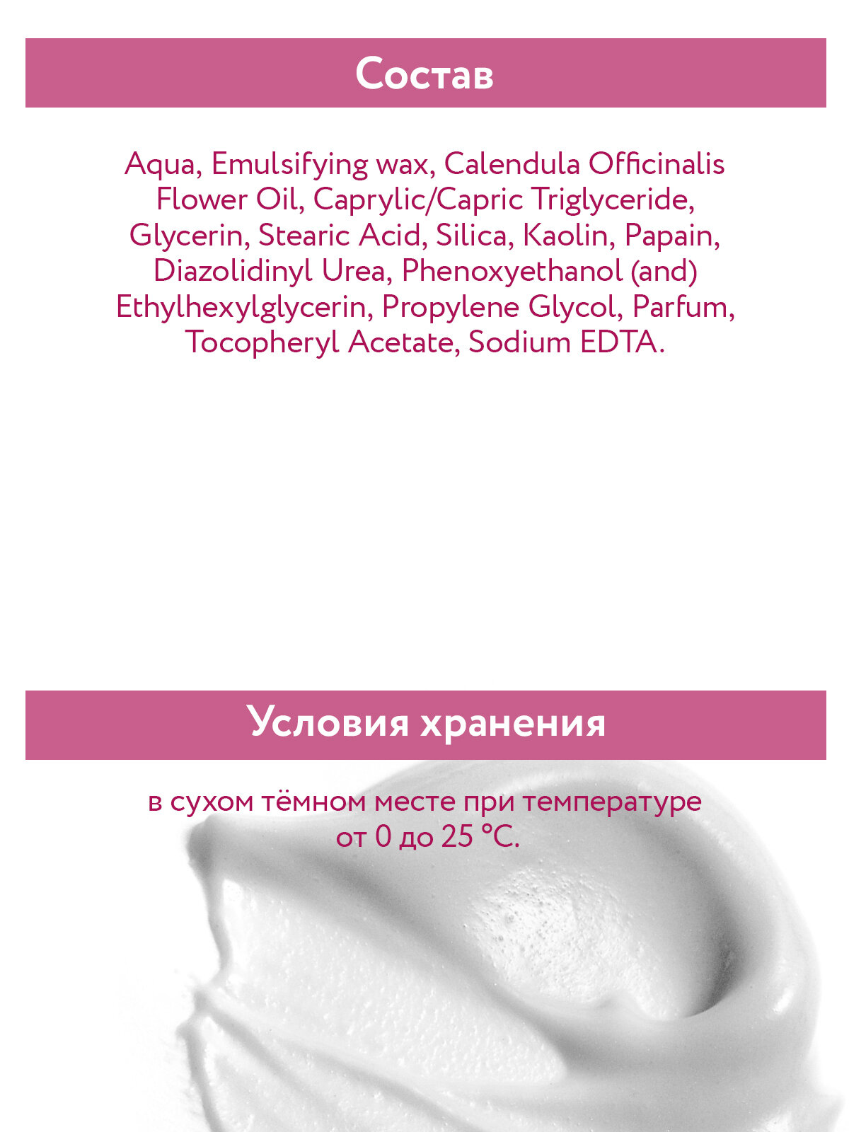 | Активные компоненты | Aqua, Emulsifying wax, Calendula Officinalis Flower Oil, Caprylic/Capric Triglyceride, Glycerin, Stearic Acid, Silica, Kaolin, Papain, Diazolidinyl Urea, Methylparaben, Propylparaben, Propylene Glycol, Parfum, Tocopheryl Acetate |