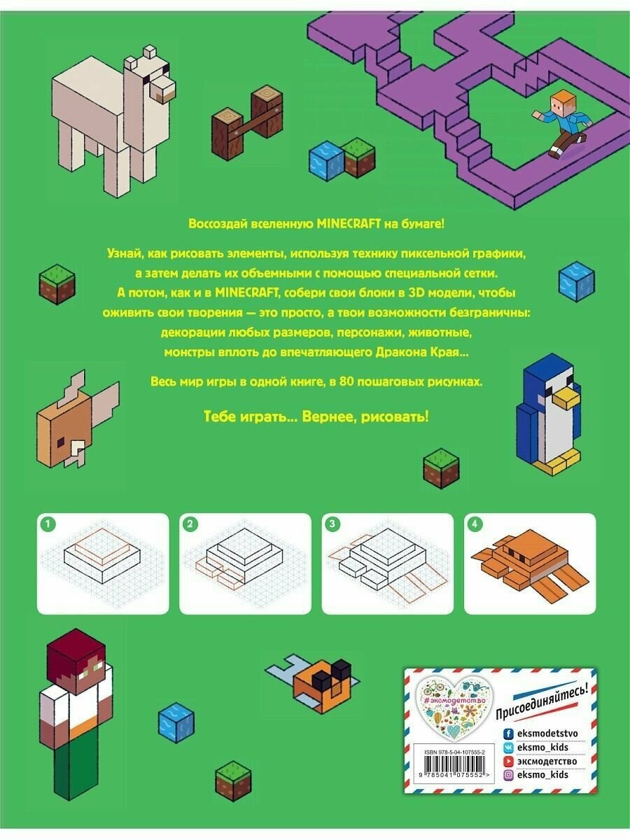 Книга- Нарисуй свою вселенную в стиле Майнкрафт понравится любому ребенку, который увлекается Майнкрафтом. В книге 80 страниц, листы плотные, иллюстрации красивые, цветные. В книге поэтапно учат, как нужно рисовать различных героев. Можно научиться рисовать различных персонажей, животных, монстров, декораций. Так же в книге есть страница со специальной сеткой. Формат А4. К покупке рекомендую.