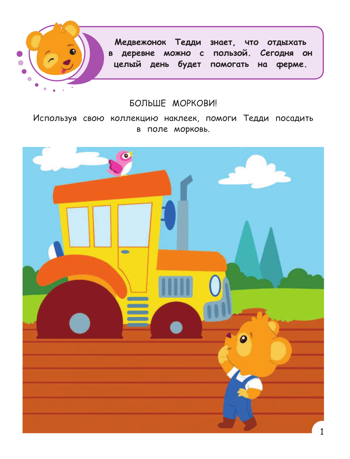 Раскрашивай, рисуй, решай задания с наклейками вместе с милым, обаятельным медвежонком. Составь компанию Тедди!