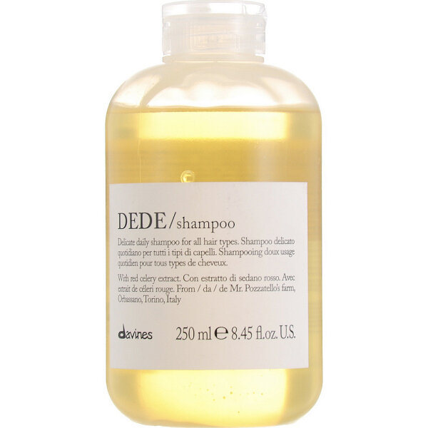 | Полное описание | Davines Dede Shampoo мягкой очищающий шампунь для ежедневного использования. Обильная пена мягко и эффективно очищает волосы оставляя их шелковистыми и блестящими. Экстракт красного сельдерея богатый минеральными солями, благотворно влияет на волосы. Идеально подходит для всех типов волос. Эффективное очищение волос без спутывания и утяжеления.Способ применения |