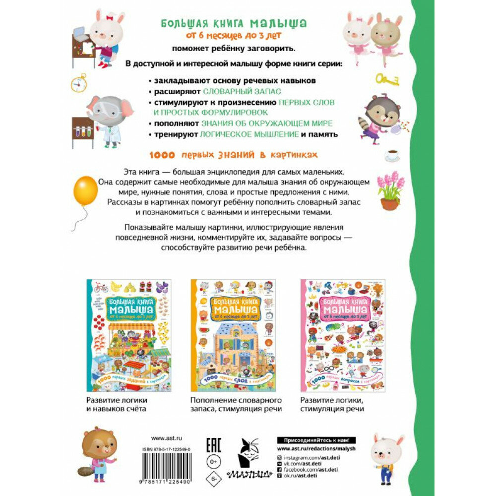 Серия "Большая книга малыша" поможет ребёнку заговорить. В доступной и интересной малышу форме книги серии закладывают основу речевых навыков, расширяют словарный запас, пополняют знания об окружающем мире, стимулируют к произнесению первых слов и простых формулировок, тренируют логическое мышление и память.