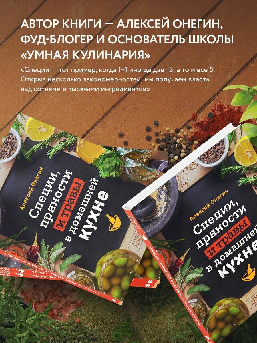 Трудно представить себе, на что была бы похожа наша жизнь, если бы в ней не нашлось места травам, пряностям и специям. Одно можно сказать точно - в таком мире не было бы ни людей, которые любят еду, ни тем более тех, кому нравится её готовить. Новая книга популярного фуд-блогера Алексея Онегина поможет разобраться в разнообразии всевозможных пряных трав, специй и других вкусо-ароматических добавок, которые делают блюда более яркими и интересными, научит импровизировать и готовить совершенно разные кушанья из одних и тех же продуктов.