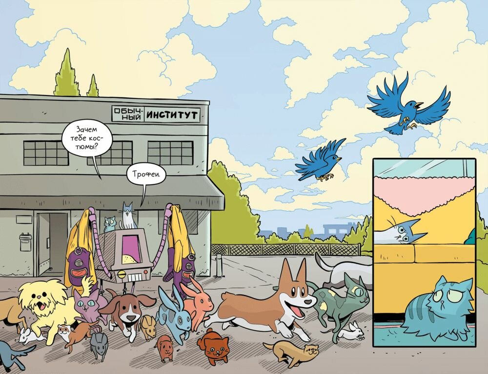 Очень смешной комикс про котов, которые надевают супергеройский костюм собаки и идут спасать мир.