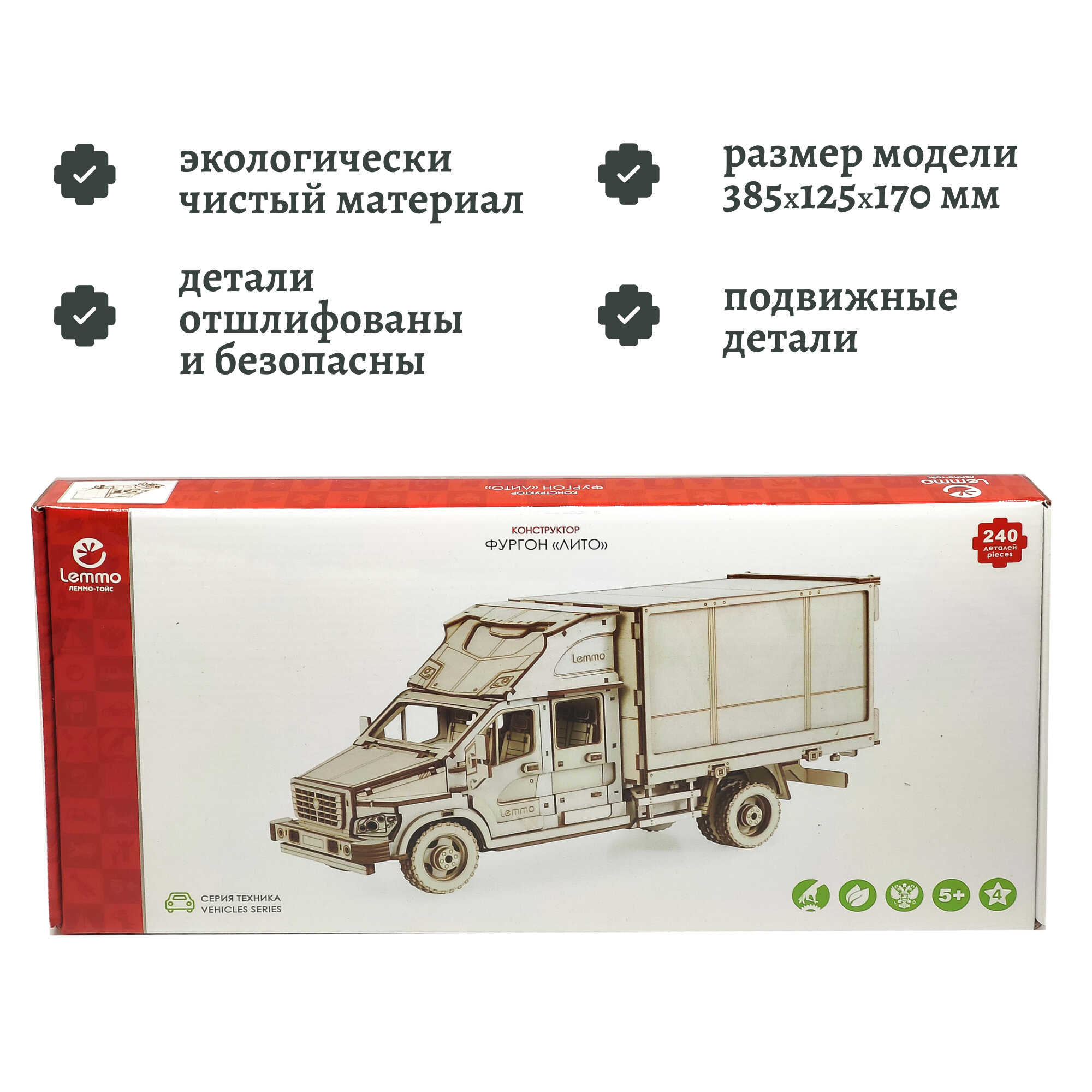 Собирается с помощью клея, который в комплекте. У собранного грузовика открывается фургон, крутятся колеса, открывается капот и двери. Для корпоративных клиентов эту модель можно заказать с вашим логотипом.
