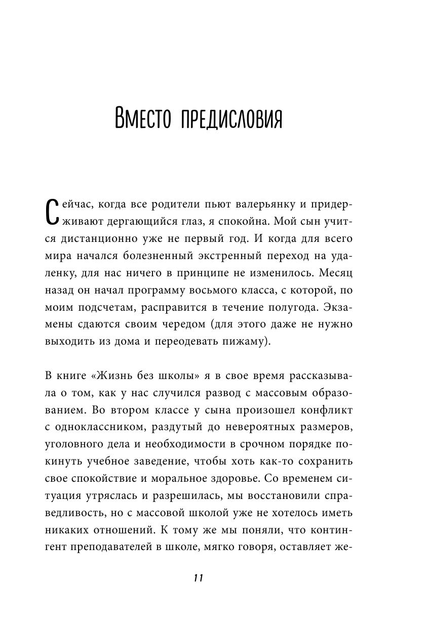 Полностью согласна с некоторыми высказываниями автора (например, что "сегодняшняя школа -это массовая история. И в ней нет места индивидуальности при всех ее заявлениях об этом"). Но также полностью не согласна с тем, что "массовое среднее образование давно устарело". Дистант должен быть, это несомненно, но как дополнение, как возможность получить те знания, умения и навыки, которые не может дать в обычном режиме образовательное учреждение. Должно быть разумное сочетание. Нельзя разрушать основы, фундамент, для того чтобы выстроить "крышу". Конечно, есть ситуации (как у автора этой книги), когда дистант для них оказался идеальным вариантом. Но это исключения. Они, конечно, есть и должны быть, мы же все разные. Нельзя всех мерить одной гребёнкой. И книга, конечно, поможет всем нам сейчас, в период, когда нас высадили на дистант. И нам надо учиться жить в этом новом мире. Учить ответственности своих детей. А учить, конечно, надо. Книга в этом поможет! В ней есть конкретные советы, примеры, сайты и ресурсы, которыми можно воспользоваться. Это очень может помочь, если только начинаешь "вариться" в этом. Книга в переплёте, бумага белая, чуть просвечивает. Текст мелковатый, но читаемый. В конце есть Список вдохновляющих книг.