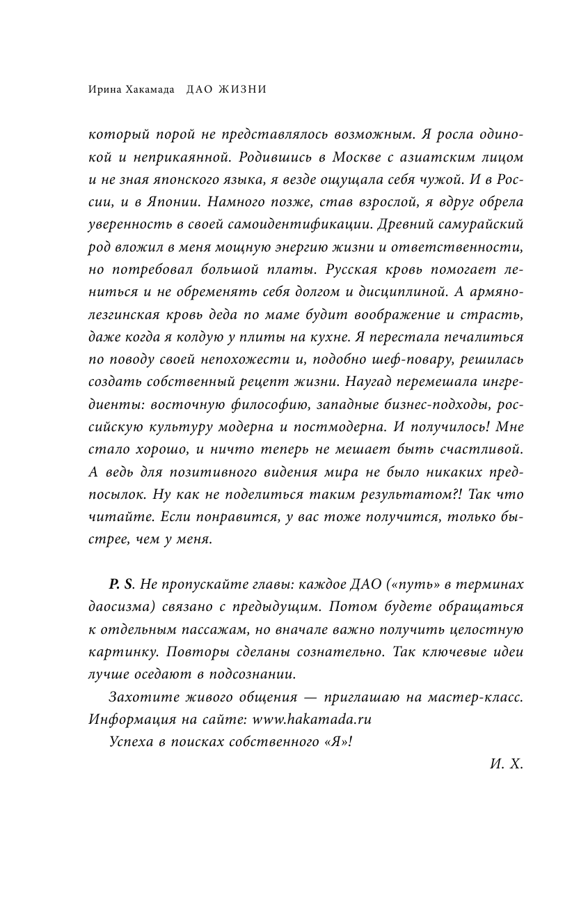 Вот уже десять лет бестселлер «Дао жизни» транслирует миру мудрость Ирины Хакамады — спикера, писателя, общественного деятеля, кандидата экономических наук, влиятельного экс-политика и незаурядной женщины. Она создала собственную формулу счастливой жизни, соединив, казалось бы, несовместимое: восточную философию, западные бизнес-подходы и российскую культуру модерна и постмодерна.