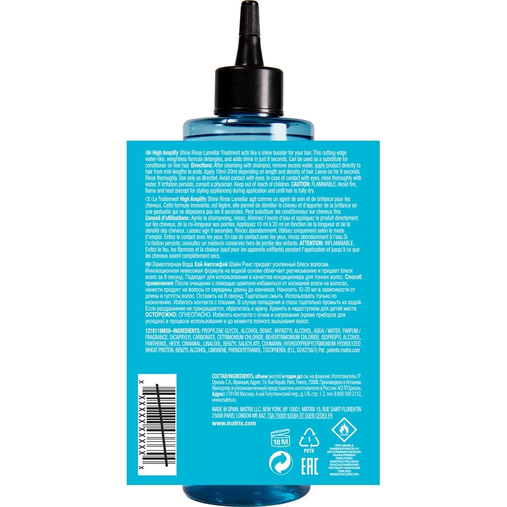 Ламеллярная вода без силиконов High Amplify Shine Rinse заменяет кондиционер в уходе и придает волосам мгновенное сияние и упругость, которые не утяжеляют объем. Подходит для всех типов волос. Невесомые кондиционирующие молекулы, активированные в воде, обволакивают каждую прядь, придавая мягкость. Мгновенное расчесывание за 8 секунд. Вода оставляет после использования приятный аромат на волосах.