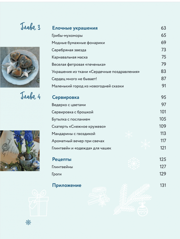 Книга совершенно не оправдала моих ожиданий. Во-первых, никакого новогоднего настроения она не создаёт, и цветы в жестяных вёдрах этому не способствуют. Во вторых, нет ни одной интересной идеи, всё очень скучно и наивно. Цветочки, сердечки, ажурные вязаные салфеточки, мандарины с натыканой в них гвоздикой, завёрнутый в нотную тетрадь подарок и всё в таком же духе.