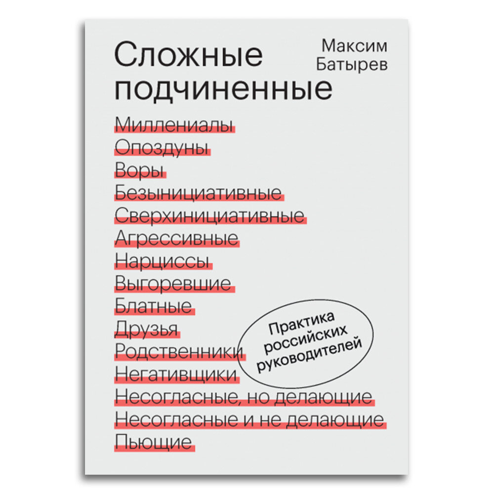 Перед тем как написать эту книгу, автор собрал и проанализировал несколько тысяч кейсов российских менеджеров. Получилось 15 категорий сложных сотрудников - от опоздунов и безынициативных до выгоревших и нарциссов. Это основные типы, которые встречаются в каждой компании. Батырев описывает их в книге и рассказывает, как с ними работать. Все советы проверены на практике.