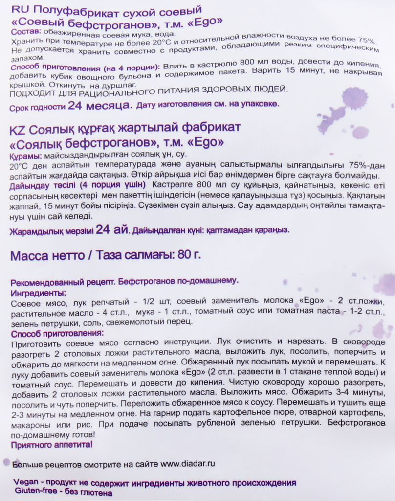 Полуфабрикат сухой соевый "Ego" "Соевый бефстроганов". Подходит для рационального питания здоровых людей.