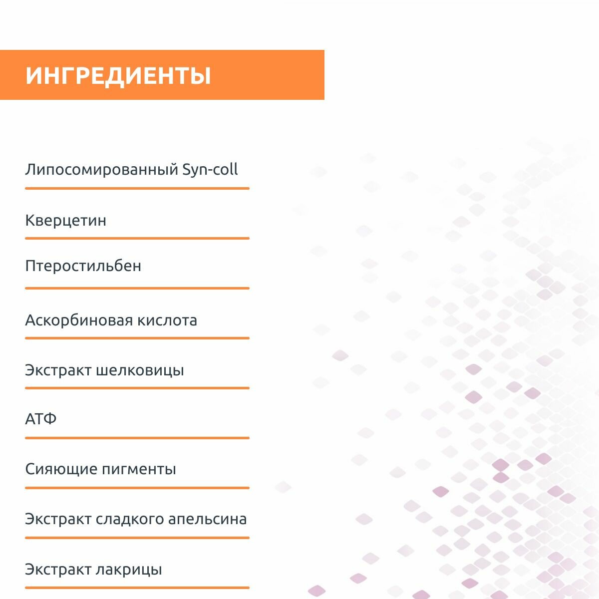 | Активные компоненты | стабилизированный витамин С (e-VIT-C), - инкапсулированный в липосомы, работает как мощный антиоксидант, способствует усиленному синтезу коллагена, сокращает количество морщин и предотвращает их появление, укрепляет кожу и придает ей гладкость и эластичность экстракт сладкого апельсина - увлажняет, восстанавливает кожу, способствует выработке коллагена, повышает упругость, выравнивает тон кожи, осветляет турмалин - обладает регенерирующими свойствами, осветляет пигментные пятна, улучшает микроциркуляцию, способствует увлажнению и питанию кожи, усиливает антиоксидантные возможности Состав |