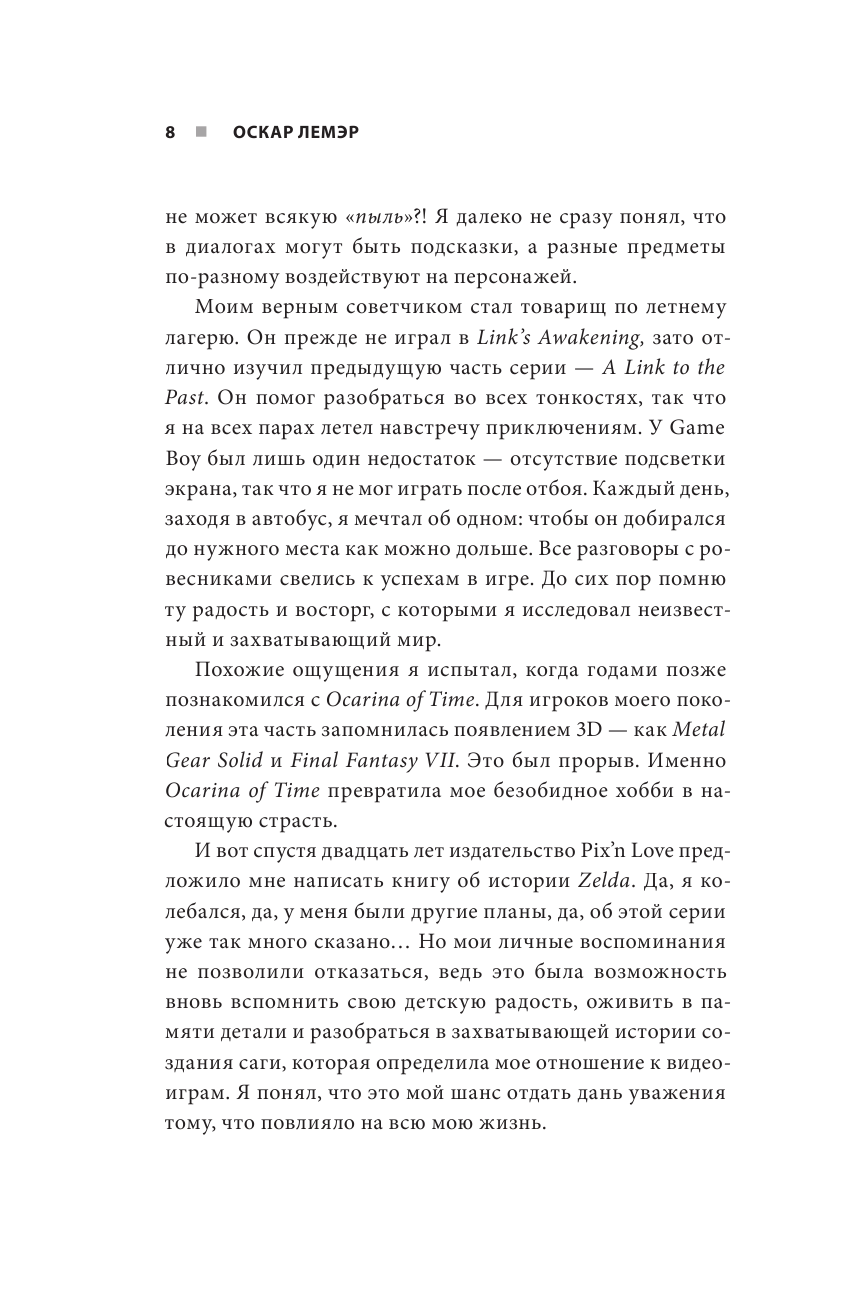 Печалит, что не было лхвата всех игр серии, а только до Ocarina of Time, а также отсутствие иллюстрации, хотя казалось бы, что мешает сделать вклейку. Также опечалило уже постоянное. венигах о видеоиграх выведение отдельной фразы в рамку на 20-25% страницы. Благо, здесь такого относительно немного.