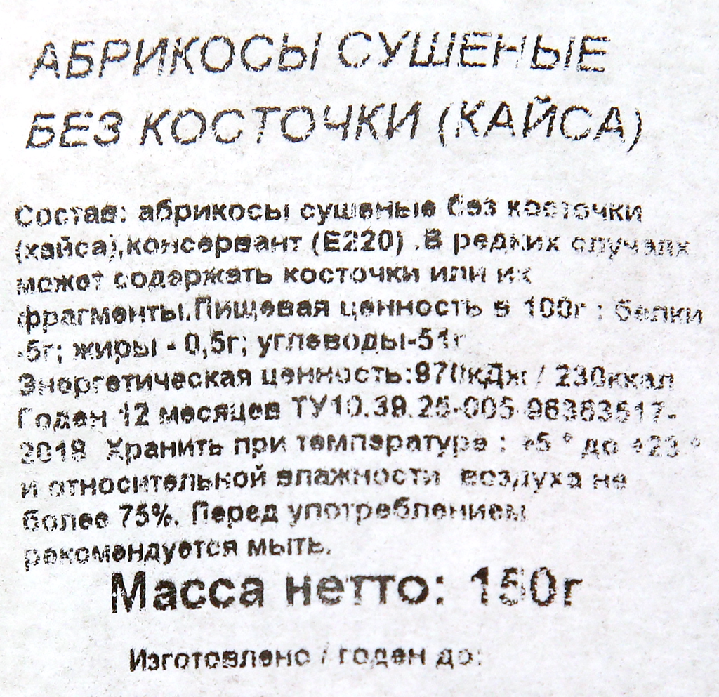 | Состав | абрикосы сушеные (кайса), консервант e220 |