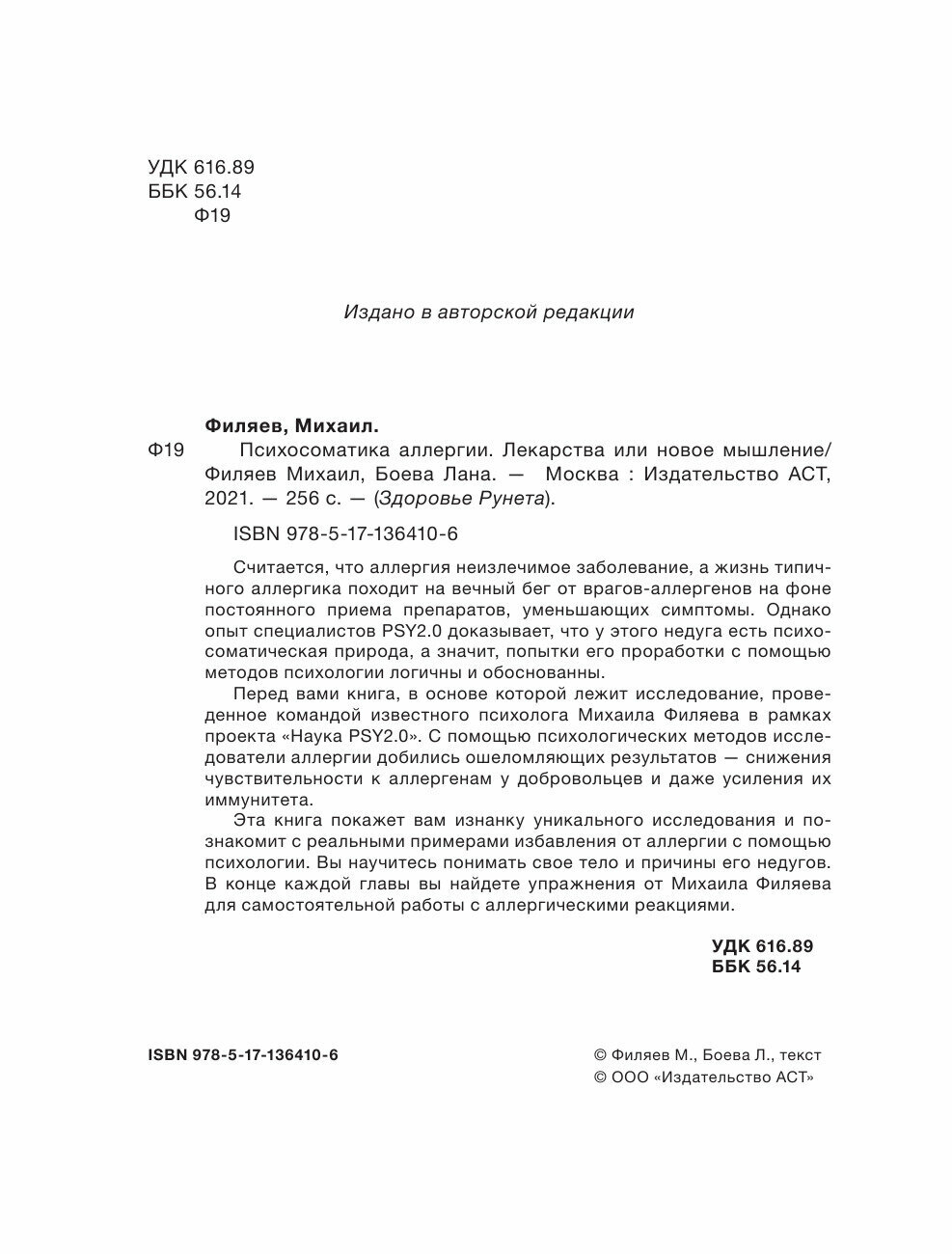 Эта книга покажет вам изнанку уникального исследования и познакомит с реальными примерами избавления от аллергии с помощью психологии. Вы научитесь понимать свое тело и причины его недугов. В конце каждой главы вы найдете упражнения от Михаила Филяева для самостоятельной работы с аллергическими реакциями.